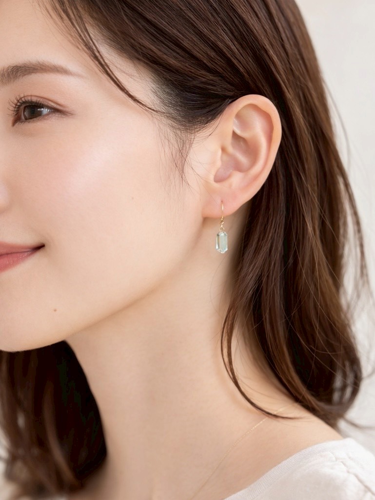 若葉のような薄グリーンに癒されるグリーンアメシストのピアス。肌を美しく見せてくれる優しい光が、グリーンアメシスト越しに映え、透明感あふれる印象に。長六角形にカッティングされたグリーンアメシストは、風にスウィングするたびにキラキラと美しく輝きます。
