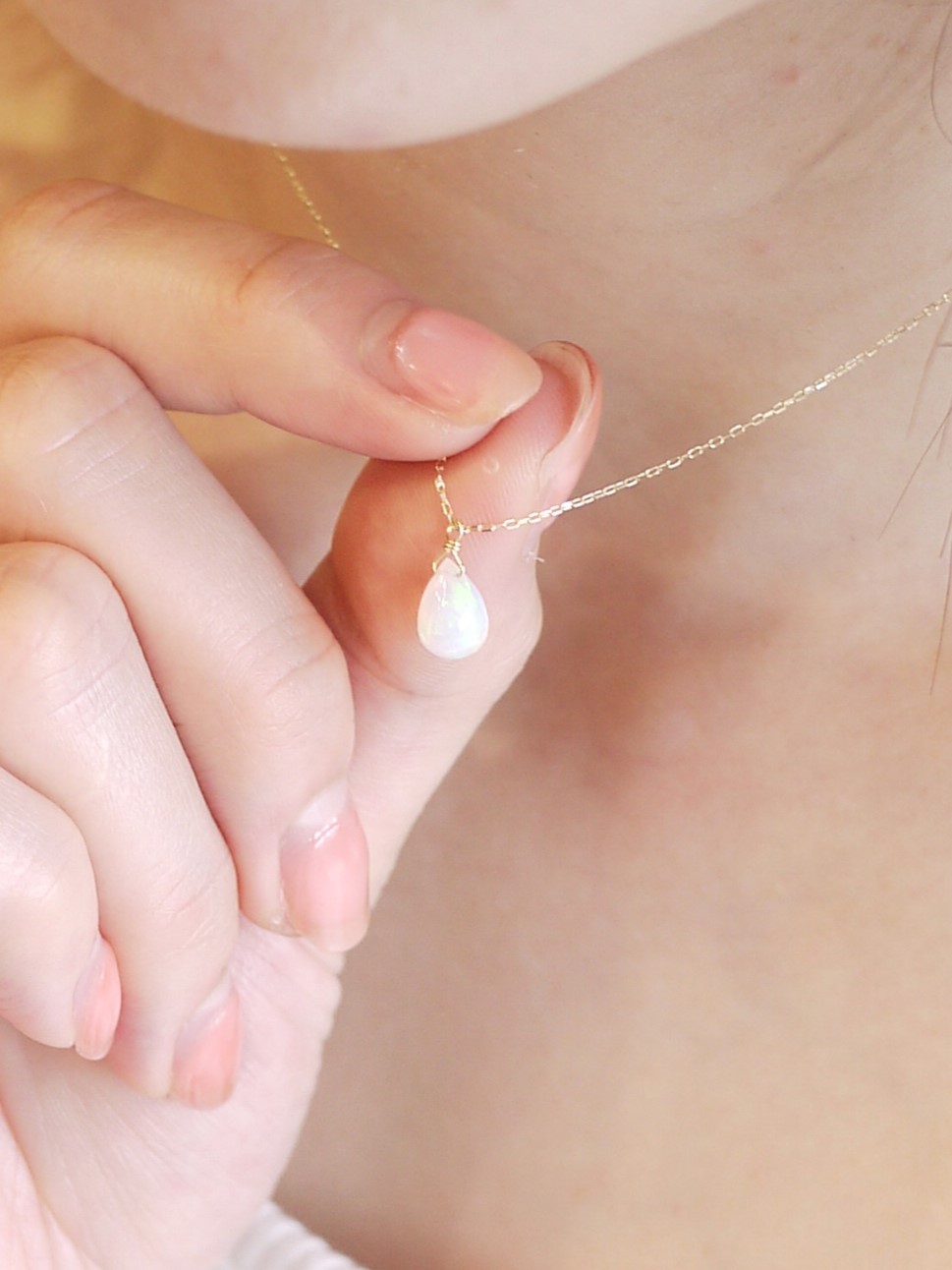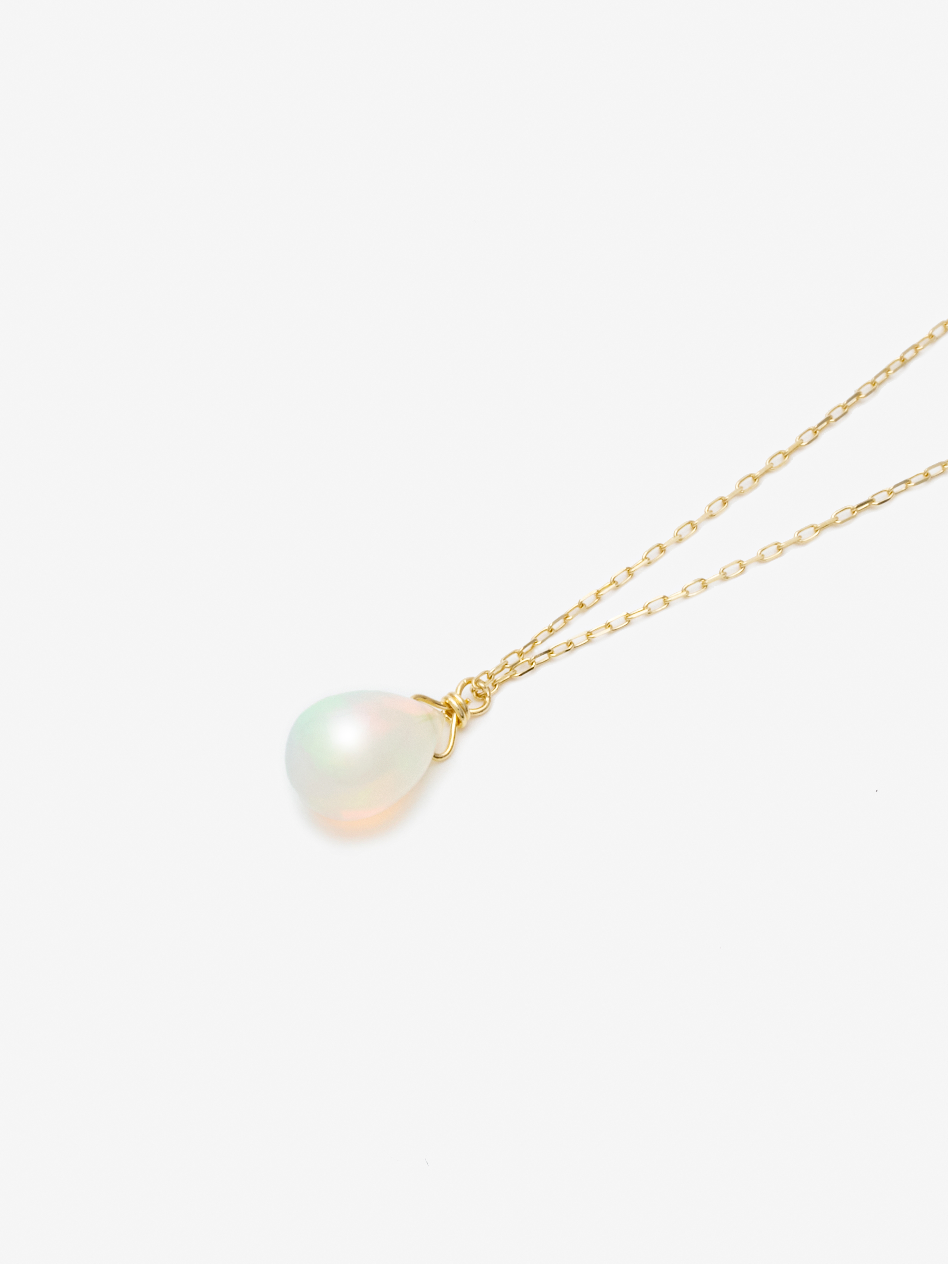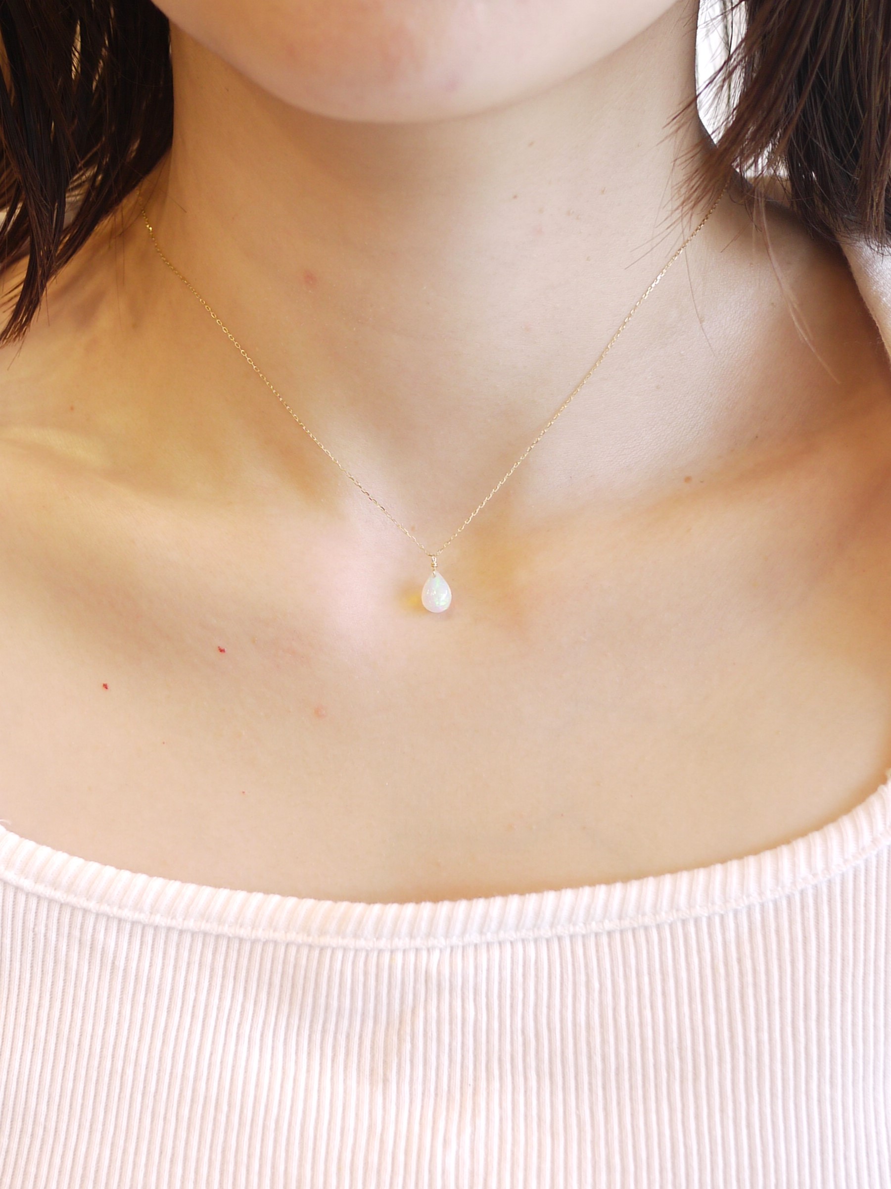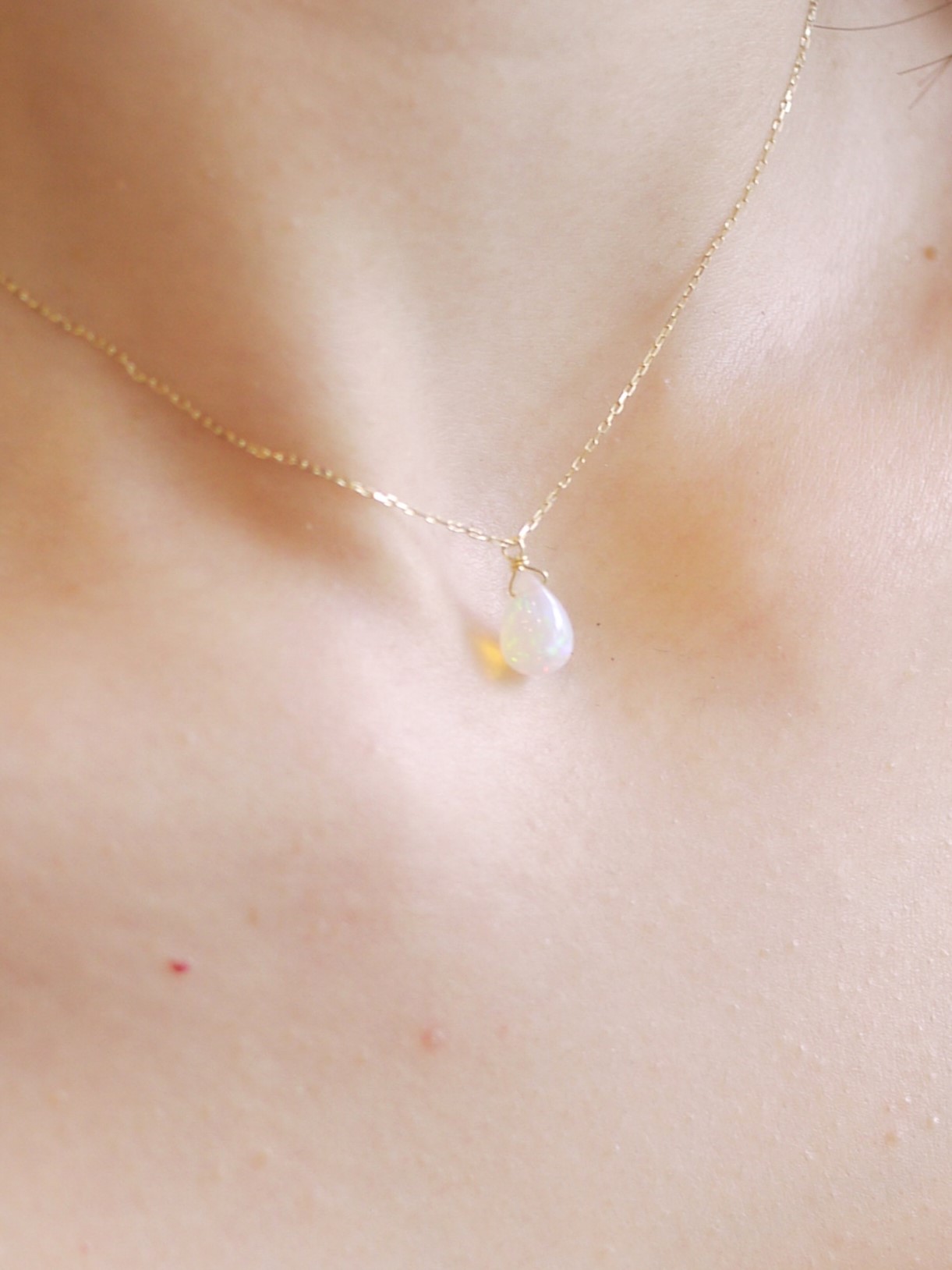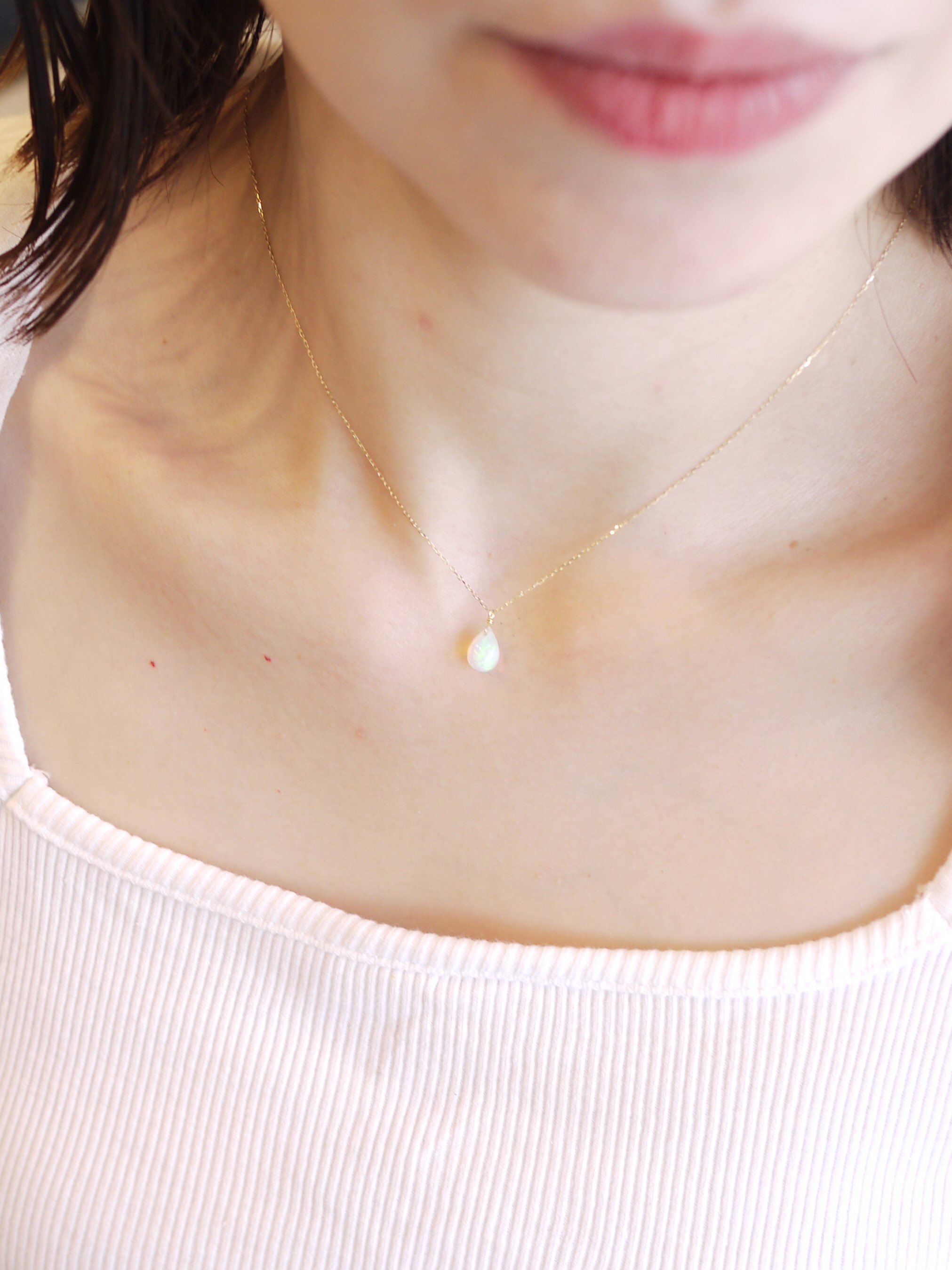 光の角度で、ふわりと表情を変えるオパールの魅力をそのままに感じられる一粒ネックレス。コロンとしたフォルムの可愛らしさと、あなたの動きに合わせて様々なカラーを見せながら輝く美しさが、胸元にやさしく寄り添いながら、内側から光を放つように輝きます。
